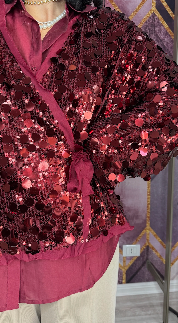 CARDIGAN TEMPESTATO DI PAILETTES E CHIUSURA AD INCROCIO.