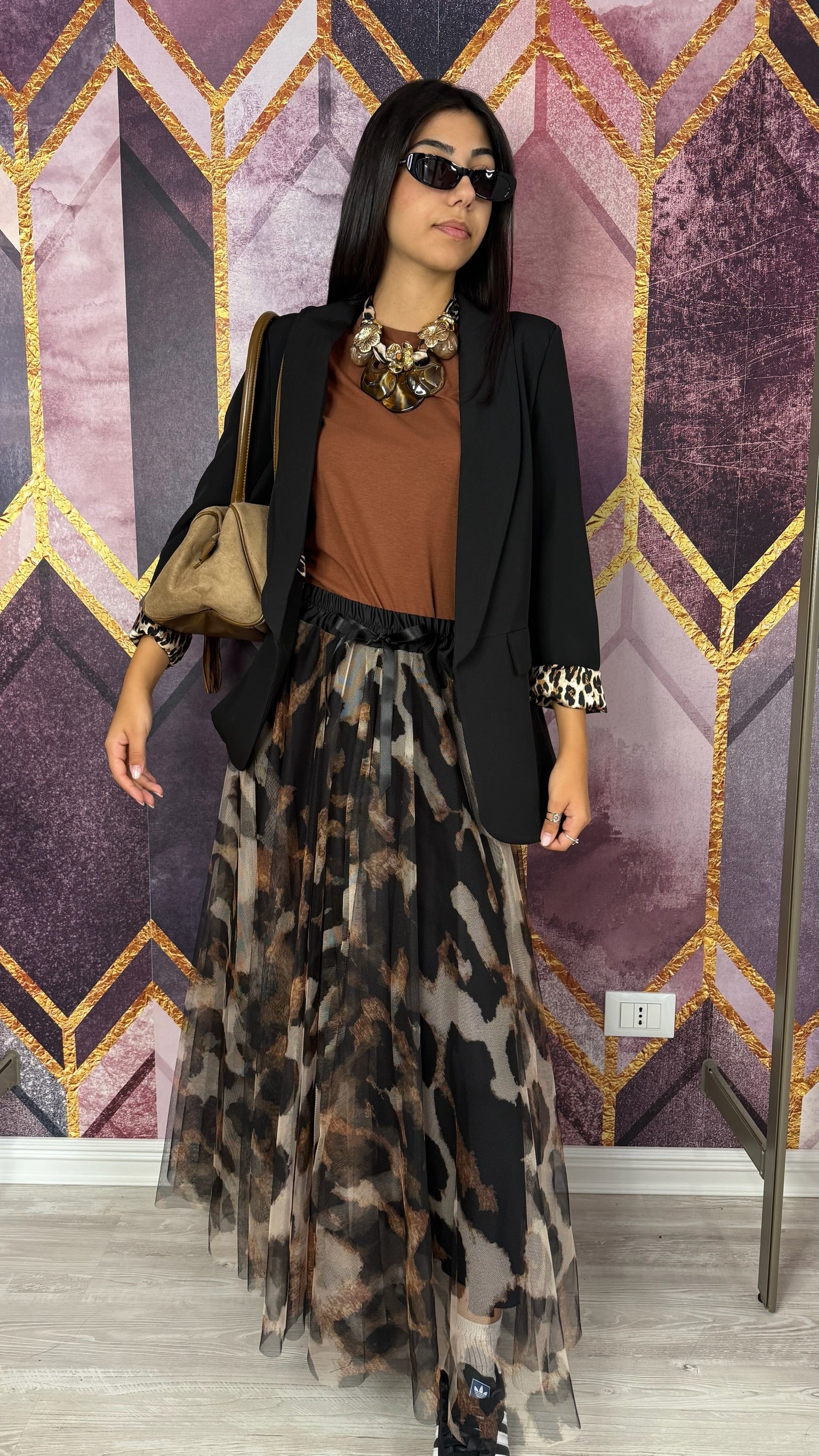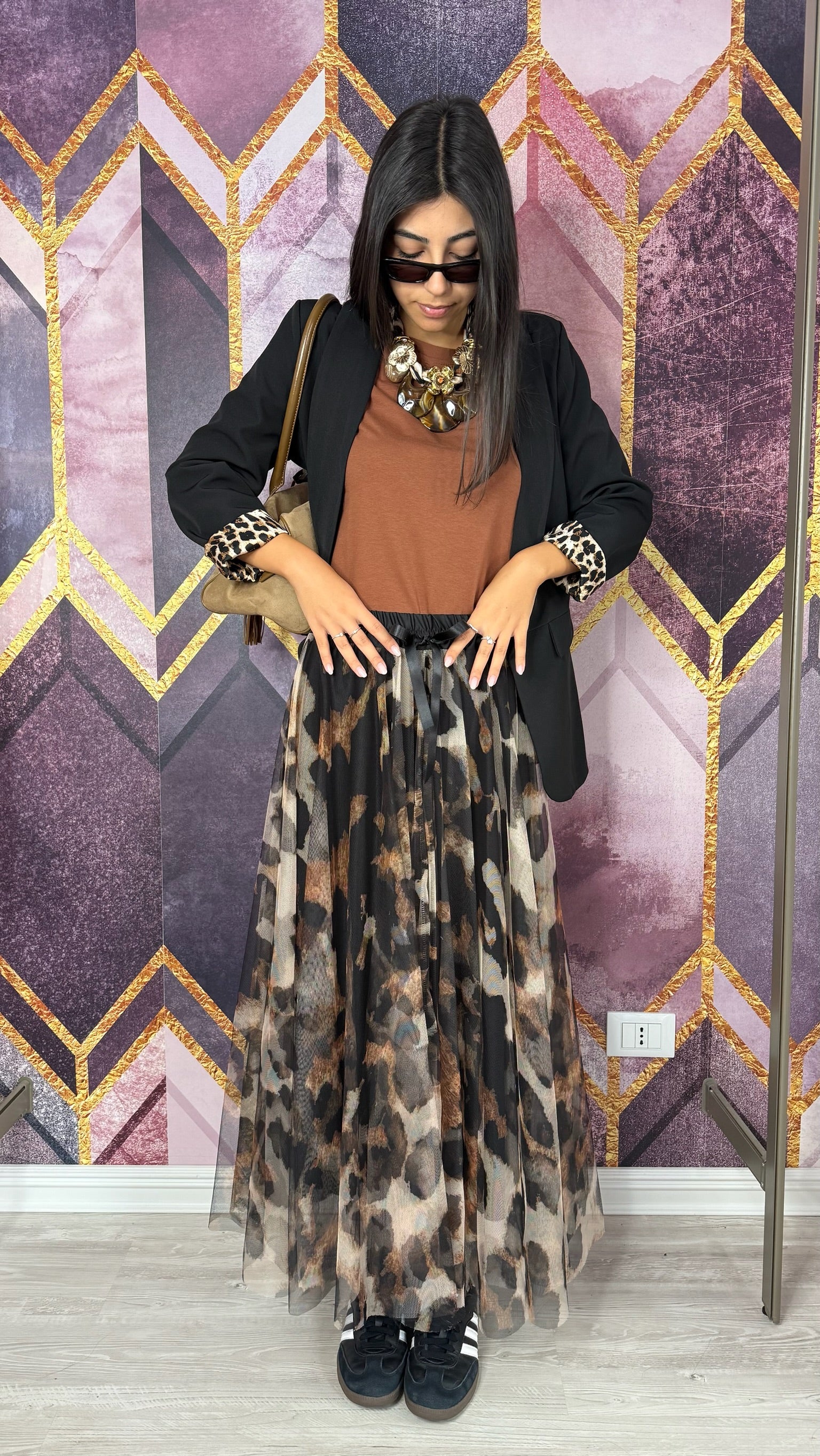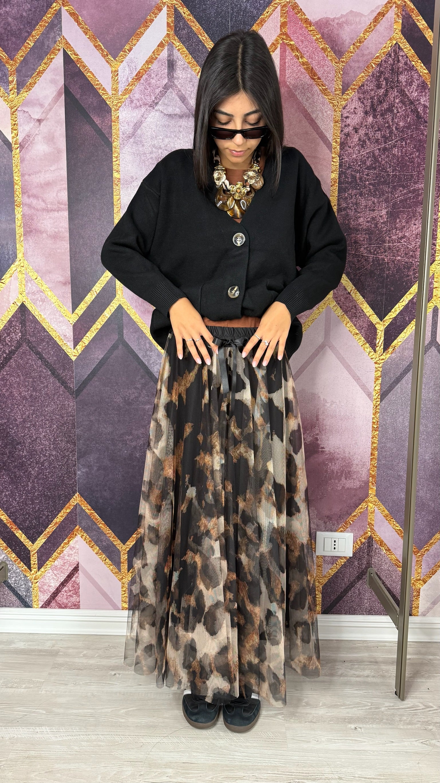 GONNA IN TULLE MACULATA CON FODERATA, ELASTICO E FIOCCO IN VITA.